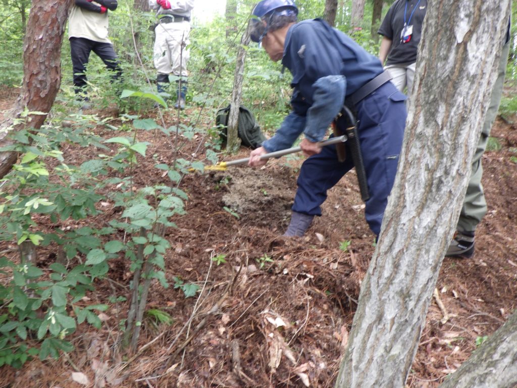 最初に室山におけるマツタケとアカマツの講義を聞いたあと、いざ、フィールドへ!「よみマツ」メンバー小林さんのレクチャーのもと、皆でマツタケの敵「ケロウジ」と「腐葉土」をかき下ろします